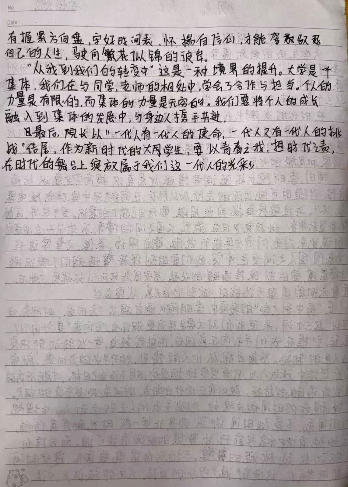 9月8日18时,校党委副书记、院长李明为全体新生讲授了题为“完成三个转变,逐梦美好未来”的开学第一课,深刻阐述了大学生需要完成的“三个转变”:从高中生到大学生的转变、从未成年人到成年人的转变、从“我”到“我们”的转变。课后,在系党总支的统一部署下,系团总支积极组织各班团支部开展学习讨论,新生们深受启发,踊跃提交观后感,用笔墨记录下自己的思考与感悟。
