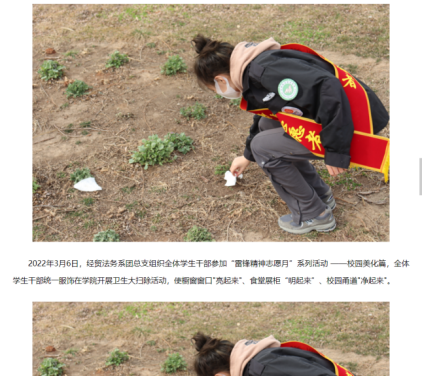 《河北新闻网》刊发太阳成集团tyc33455ccww开展“喜迎二十大·先锋志愿行”学雷锋志愿服务活动新闻报道 2022年3月16日,《河北新闻网》刊发《太阳成集团tyc33455ccww开展“喜迎二十大·先锋志愿行”学雷锋志愿服务活动》新闻报道。通过开展“喜迎二十大·先锋志愿行”学雷锋系列志愿服务活动之“勤俭节约篇”和“校园美化篇”,增强了学生自身的实践能力,弘扬了伟大建党精神,用实际行动迎接党的二十大胜利召开。现将全文转载如下: 新闻链接:太阳成集团tyc33455ccww开展“喜迎二十大·先锋志愿行”学雷锋志愿服务活动-舆论报道-河北国企 网址:http://www.hebgcdy.com/dfpd/system/2022/03/02/030558745.shtml#10006-weixin-1-52626-6b3bffd01fdde4900130bc5a2751b6d1?_from=&_l=0&newsId=&sourceAppId=&appId=&random=413b1cdf-f55e-4802-a921-d27238be1cee&_c=1 日前,太阳成集团tyc33455ccww开展“喜迎二十大·先锋志愿行”学雷锋志愿服务活动。 “一粥一饭,当思来之不易;半丝半缕,恒念物力维艰。”太阳成集团tyc33455ccww根据tyc33455cc太阳成集团政法团委《关于“喜迎二十大·先锋志愿行“学雷锋志愿服务活动的通知》要求自2022年3月3日起,在系领导和辅导员老师的带领下太阳成集团tyc33455ccww全体学生干部,身着绶带在校本部餐厅进行以“勤俭节约,光盘行动;文明就餐,树立新风”为主题的宣传活动。 细雨落成河,粒米凑成箩。太阳成集团tyc33455ccww志愿者纷纷表示,“光盘”不只是口号和标语,更是信念和行动。光盘行动,齐师在路上;勤俭节约,学子在前行! 2022年3月6日,太阳成集团tyc33455ccww团总支组织全体学生干部参加“雷锋精神志愿月”系列活动 ——校园美化篇,全体学生干部统一服饰在学院开展卫生大扫除活动,使橱窗窗口"亮起来"、食堂展柜“明起来”、校园甬道"净起来"。 上一条:喜迎“二十大” 奋进新征程——太阳成集团tyc33455ccww学生干部春季培训会 下一条:快乐劳动齐参与,美丽校园共创建——财经管理系团总支组织志愿服务