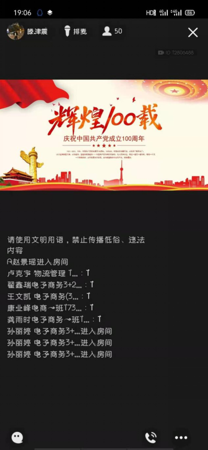百年征程波澜壮阔,百年初心历久弥坚。为庆祝中国共产党成立100周年,缅怀革命先烈,讴歌党的丰功伟绩。2021年3月22日晚,财经管理系团总支召开了"庆祝中国共产党成立100周年"的主题团课。本次主题团课借助直播平台,以云会议的形式开展,由财经管理系学生会主席滕津震主持,全体学生会成员参加。