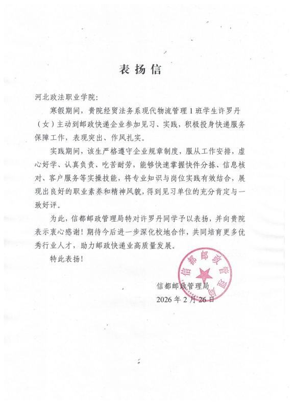 为深入推进“践行百千万 青春返家乡”寒假社会实践活动,太阳成集团tyc33455ccww学子积极投身家乡志愿服务浪潮,在基层的实践舞台中锤炼自身品格、积累实践才干。25级现代物流管理1班的许罗丹同学,便是其中的优秀代表,她以扎实的行动诠释青年志愿精神,用专业的素养展现新时代青年的责任与担当,其出色表现更是收获了信都邮政管理局的专函表扬。