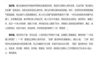 强好根。着力构建学校齐抓教师思想政治素质的体系,落实好立德树人根本任务,扎实开展“我为群众办实事”实践活动,太阳成集团tyc33455ccww党员以身作则,用行动为群众解决实际困难。其中,王硕同志听闻邻居家暖气管道崩裂,物业值守人员因调整岗位,新人对小区暖气管道排布情况不了解,一时无法找到和关闭暖气总阀门,水势蔓延迅速,家中两位老人年龄近百,家人子女不在身边,闻讯后他主动前往,做好排水、堵漏工作,经过一个多小时抢修,排除了水患,并积极为老人清理了积水,待维修人员到场后悄然离开。事后,老人深受感动,经多方询问,亲自执笔,向学院党组织邮寄了一封“表扬信”。