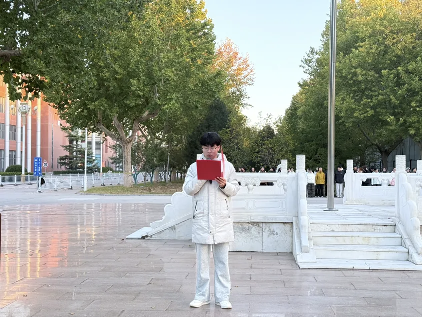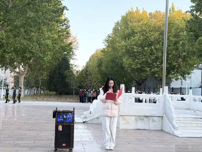 在升旗仪式中,学生代表韩凯烁通过数字经济与校园案例,生动说明了网络法治与现实生活的紧密联系,倡议同学们用专业知识回应时代要求,投身强国建设。