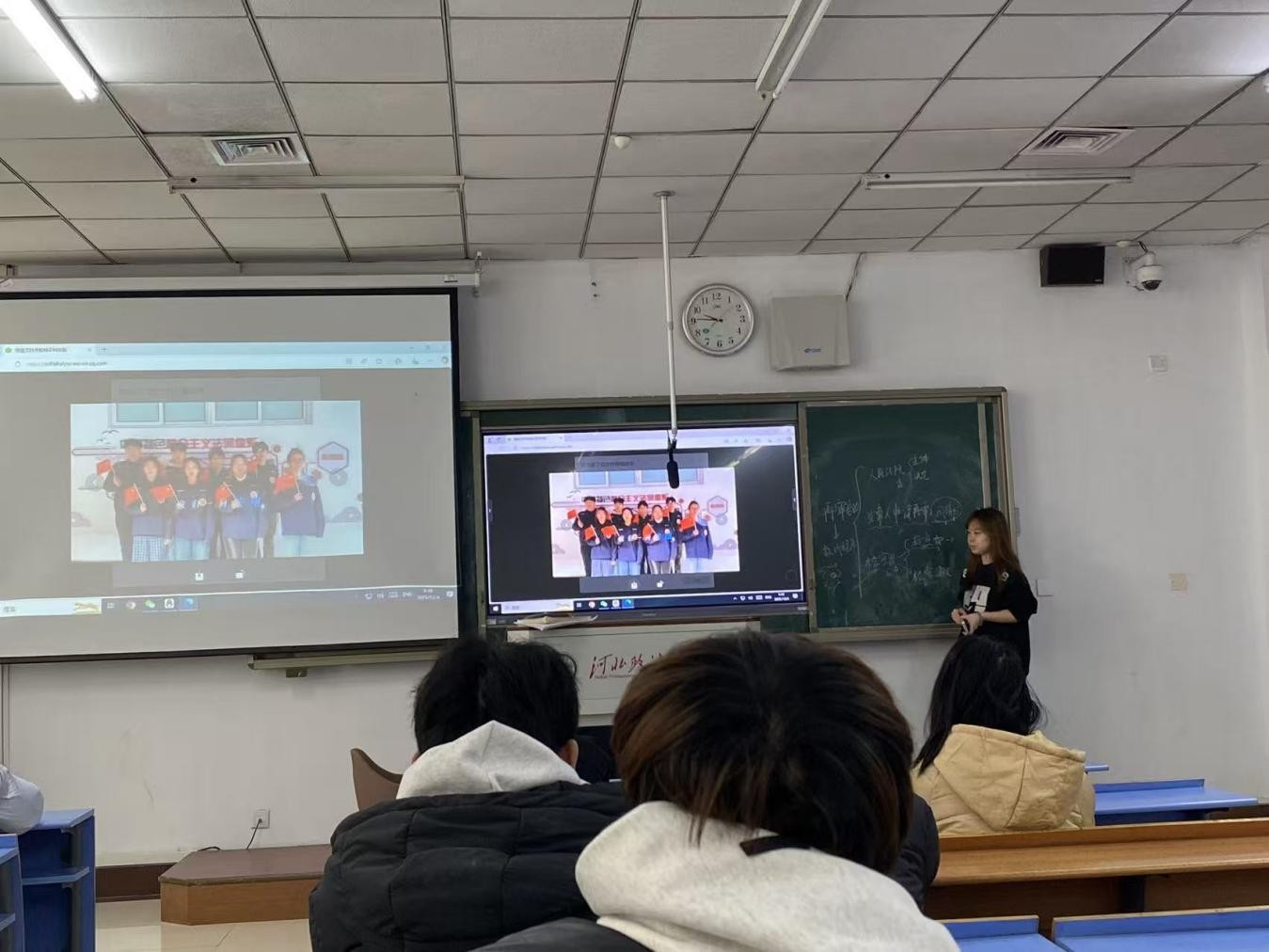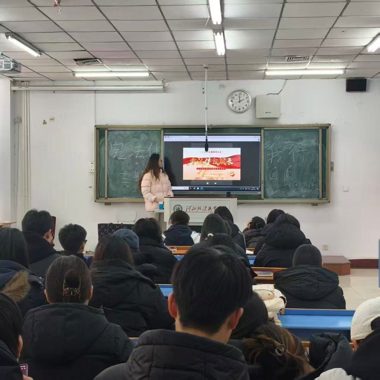 各班级集中观看了由我系学生自主创作拍摄的《宪法伴我成长》主题歌曲MV。这部充满青春气息的作品,以动人的旋律和熟悉的校园画面,生动抒发了同学们对宪法的尊崇与信仰,引发了广泛共鸣。