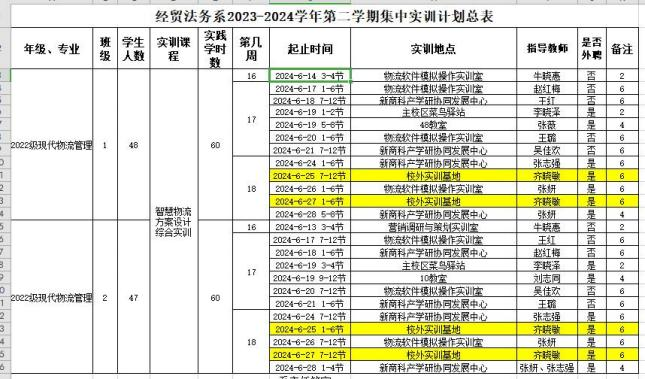 实训教学方面,2023-2024学年第二学期聘请齐晓敏担任《智慧物流方案设计综合实训》外聘实训教师,为2022级现代物流管理专业1、2班授课合计24学时。同时,丽迅物流也参与到实训合作企业中,为学生实训提供了场地、人员的大力支持。