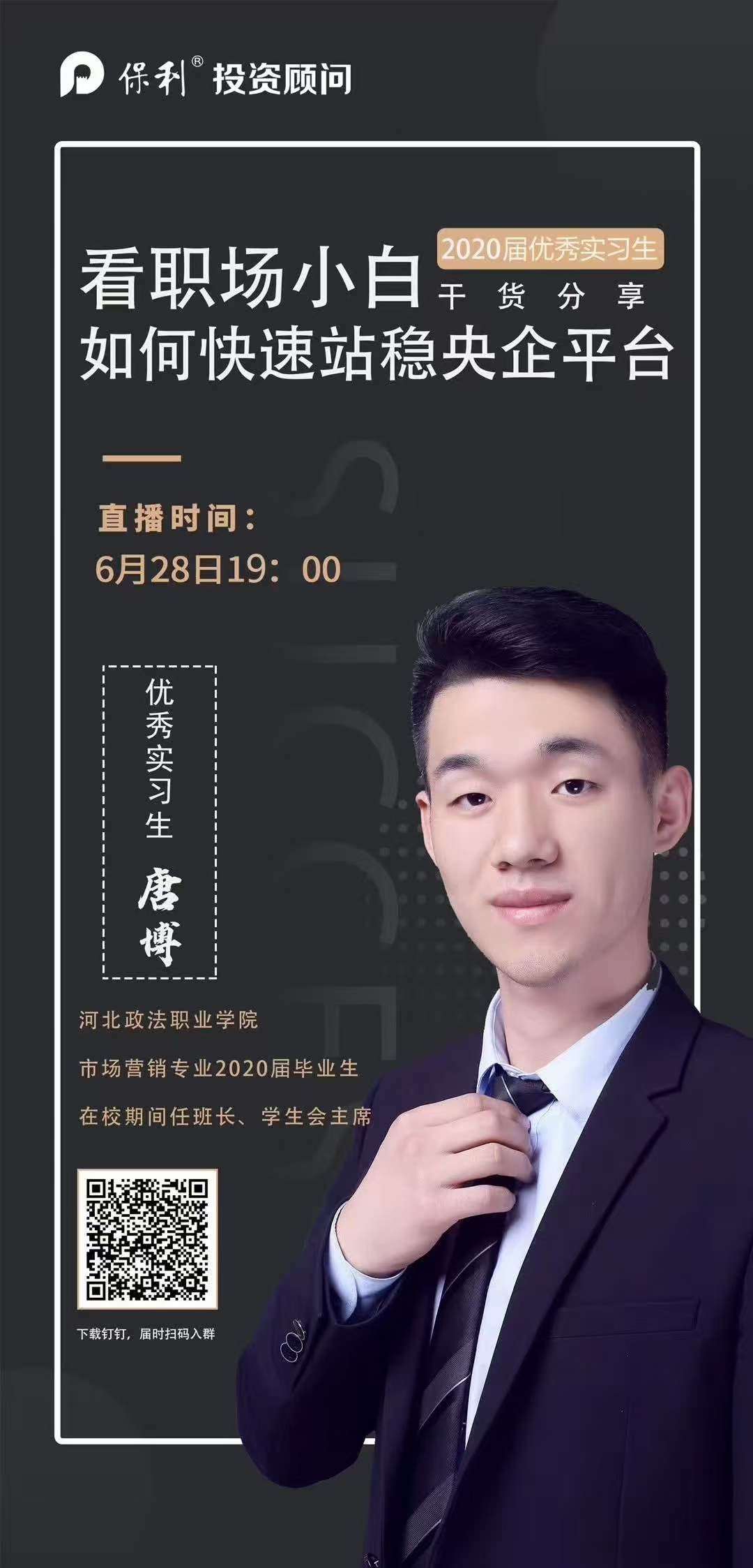 此次线上分享会于2020年6月28日19:00在钉钉平台举办,由在保利地产投资顾问有限公司石家庄房地产经纪分公司实习的2020届毕业生唐博同学主讲。唐博同学是2017级市场营销专业的学生,在校期间努力学习,积极参与各项活动,任班级班长和系学生会主席,通过系里组织的双选会进入保利投顾,经过一对一带教,成长飞速,在新开楼盘项目中售出40套,受到公司的认可与赞赏。