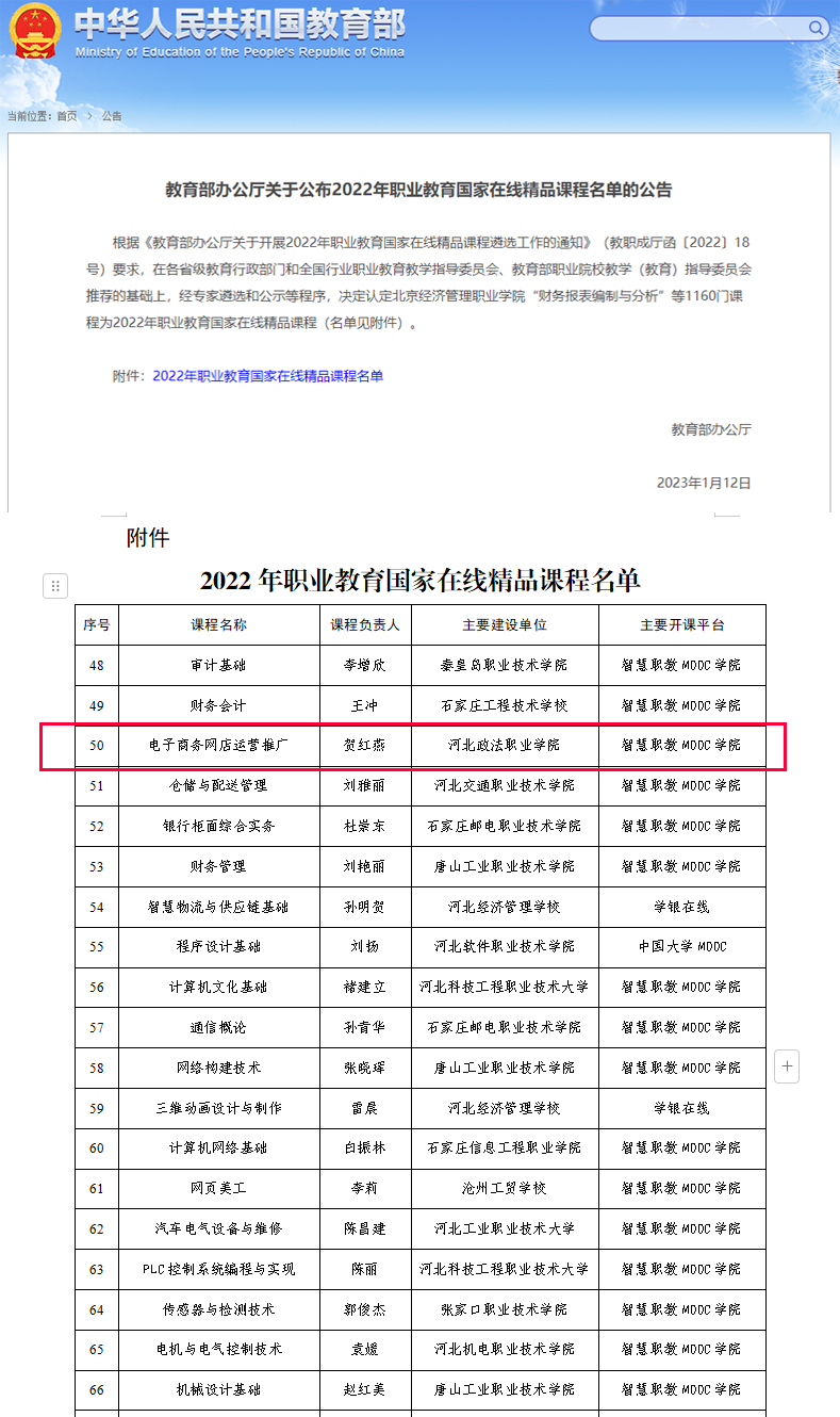 2022年《电子商务网店运营推广》课程入选国家在线精品课程